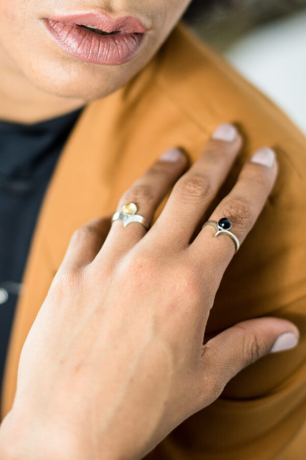 Ces bagues en argent 925 millièmes et cabochon d’onyx (noir) et citrine (jaune), issues de la Collection “Victory” au forme de “V”, symbolisent la Victoire, la force, la liberté, et s’inspirent de l’envolée des oiseaux déployant leurs ailes. Tailles disponibles : 52 en citrine et 55 en onyx. Autres tailles disponibles sur commande.